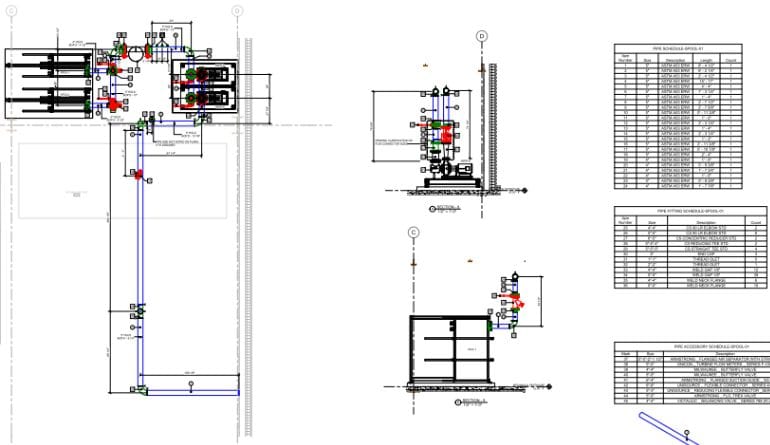 While shop drawings show the overall system layout, spool drawings break it into buildable segments with exact pipe lengths, fitting types, weld points, and labels.